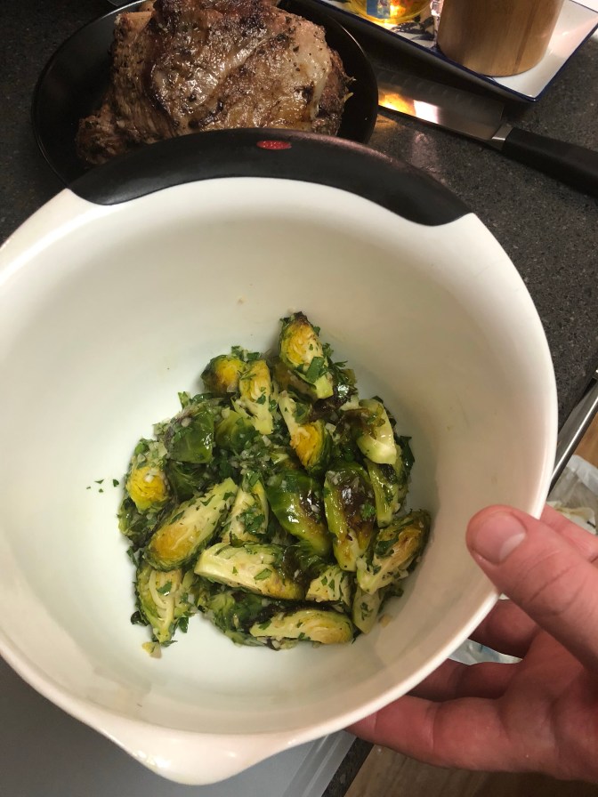 Here’s a quick and easy way to put together Lamb chops, brussels sprouts and rice for a great Sunday night meal for two.