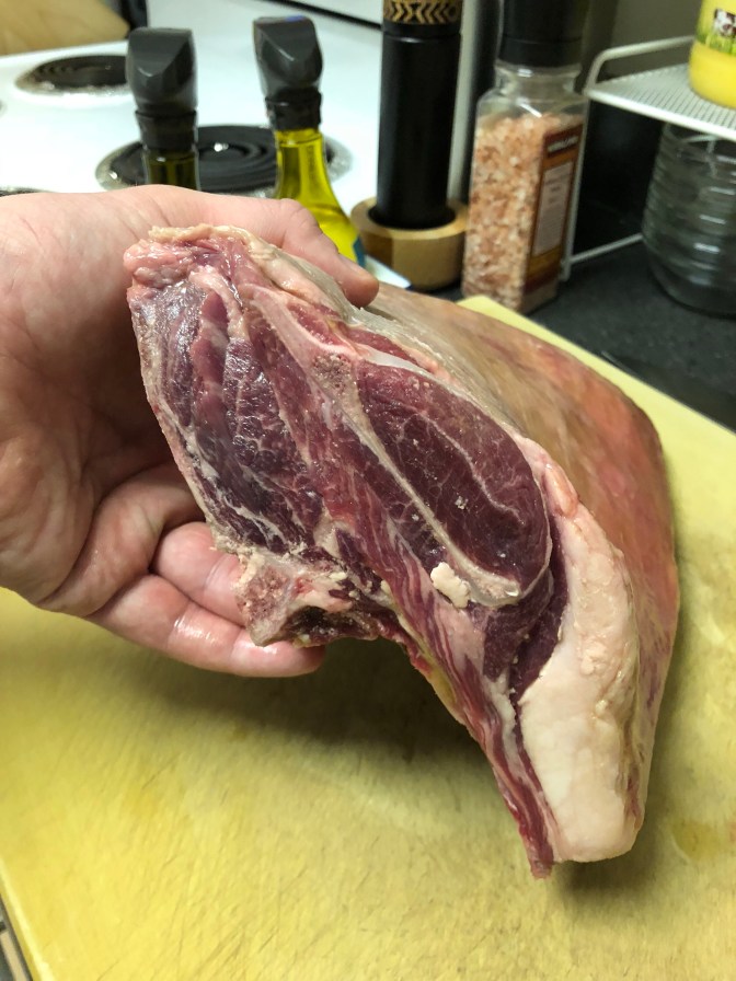 This is a bone-in loin. This is a cut of meat you’re probably used to seeing on a different animal, in the form of a “rack of lamb”. In most of these cases, the “cap” has been taken off, and the meat between the bones has been cleaned out — in which case the rack has been “Frenched”. It looks quite different “fully clothed”, no?