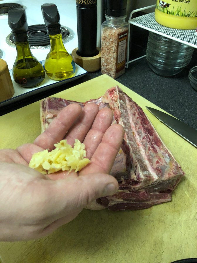 Looking in my refrigerator for things I have and cross referencing it with what those cultures’ cuisines would use, I found ginger, garlic and mustard. So that’s what I’m starting with as a base. And I know all these ingredients will work together because very rarely are they found in a natural environment without the others being close-by.