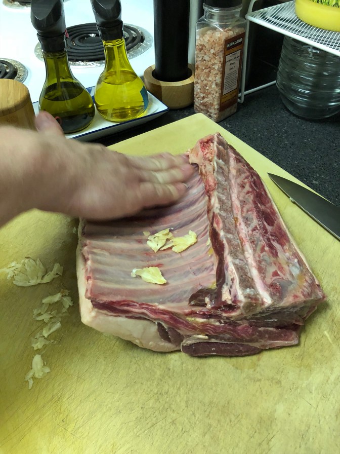 Garlic prep tip: I’m smashing the garlic to be able to rub it on the meat as a rub. What this means is, don’t just crush a clove of garlic, smash the shit out of it. Rock your knife back and forth, and slide it front to back, making sure to squeeze the oils out. You’ll recognize the difference by how it looks, feels and smells. A simply crushed clove of garlic looks sexy on a TV show. A smashed clove of garlic smells like sexy fucking garlic.
