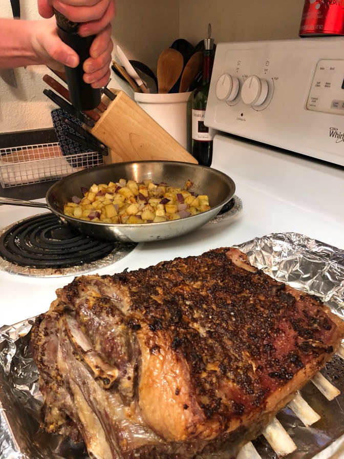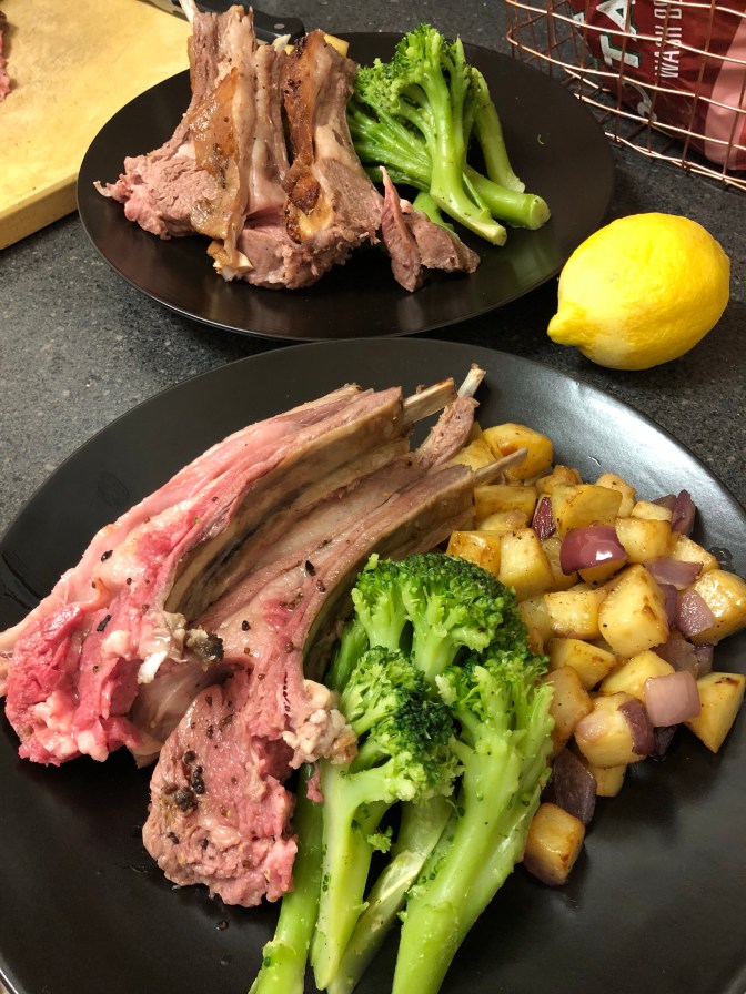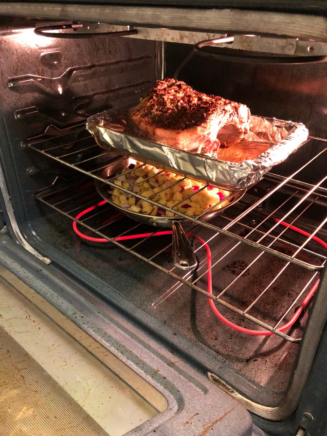 Then place it in the oven. It would seem that about 15 min for the veg. and 22-25 min for the meat makes things perfect. I’m treating this goat like lamb (closest animal that I’m quite familiar with), so I’m taking it out once the internal probe thermometer reads between 110 and 115 degrees F, it’ll be a reliable medium-rare.