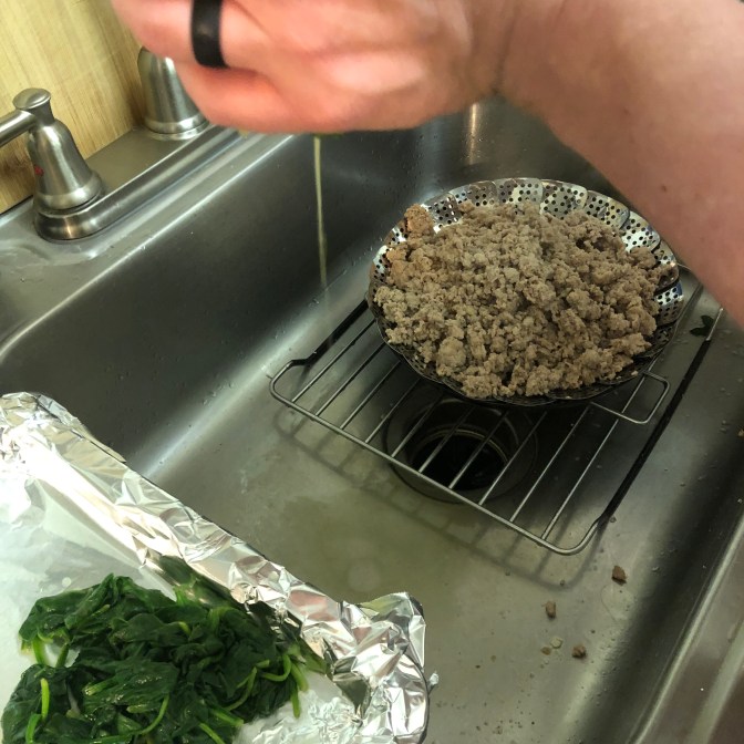 Strain the meat over a colander just to get the juice and fat out and transfer it to the sheet that previously contained the spinach.