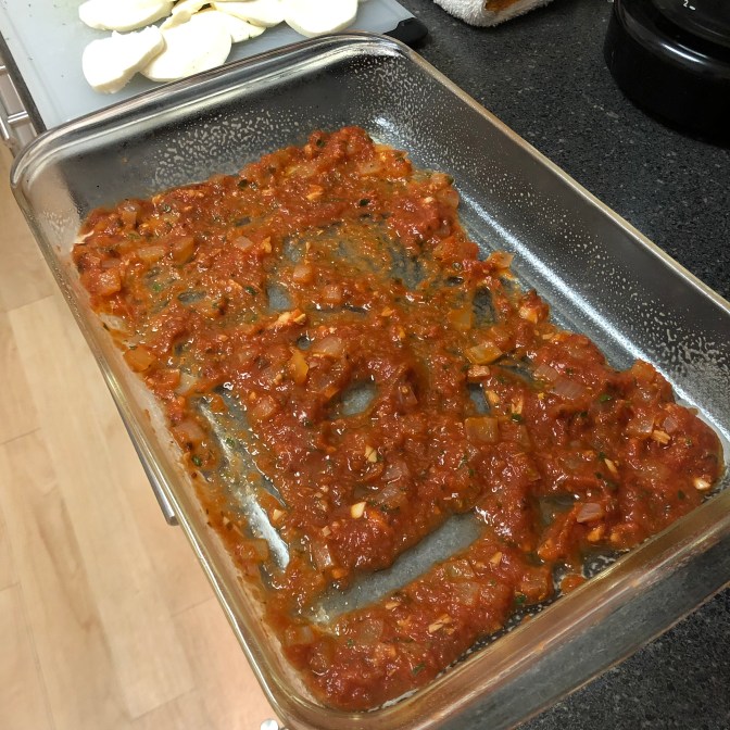 Put a thin layer of sauce on the bottom of a casserole dish. Here, I’m using a 12″x18″glass pyrex. Make sure to use cooking spray or olive oil to line the bottom and sides of the dish.