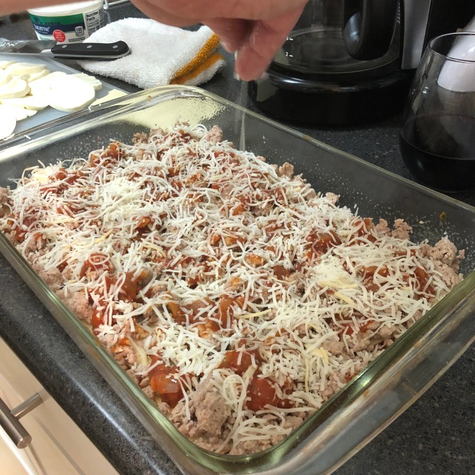 Now add a layer of cheese. I’m using a blend of various shredded Italian cheeses.