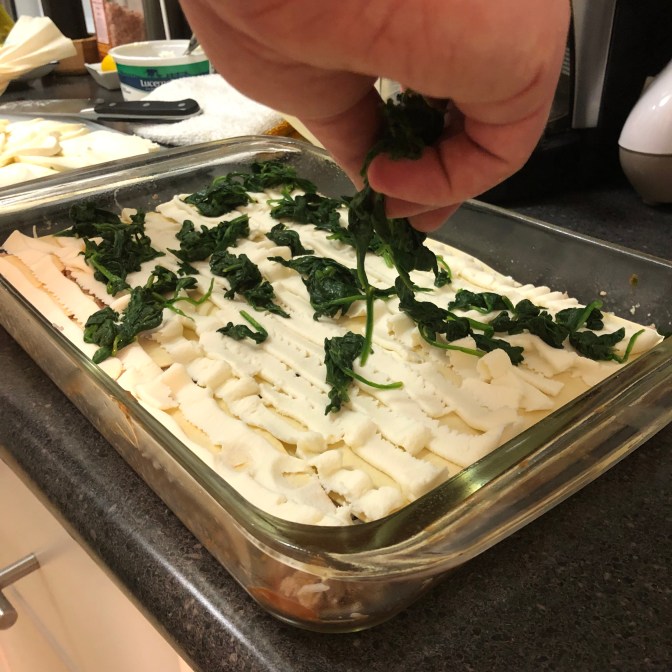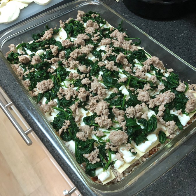 Like most pasta, a great thing about lasagne is all the different things you can put in it. Here, I’m layering in ground pork and spinach.
