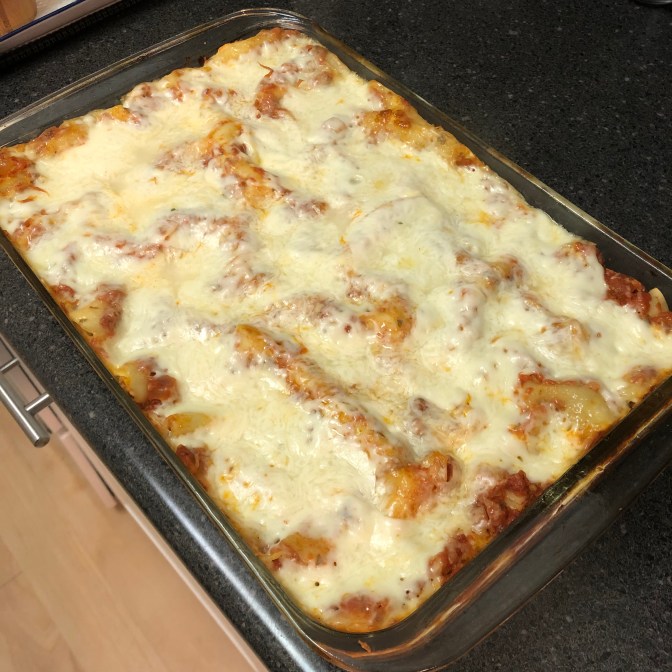 I recommend covering the dish with tinfoil to cook (roughly 40 min at 400 degrees). You want it to be hot all the way through so the cheese melts. This can be determined really well by using a cake tester, or a knife, to stick into the center of the lasagna, wait five seconds and pull it out. If it’s hot to the touch, your dish is cooked all the way. Then removing the foil covering and letting it sit under the broiler to finish.