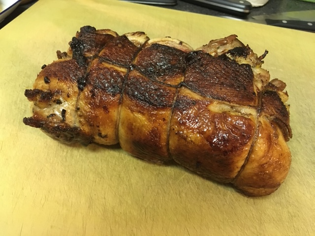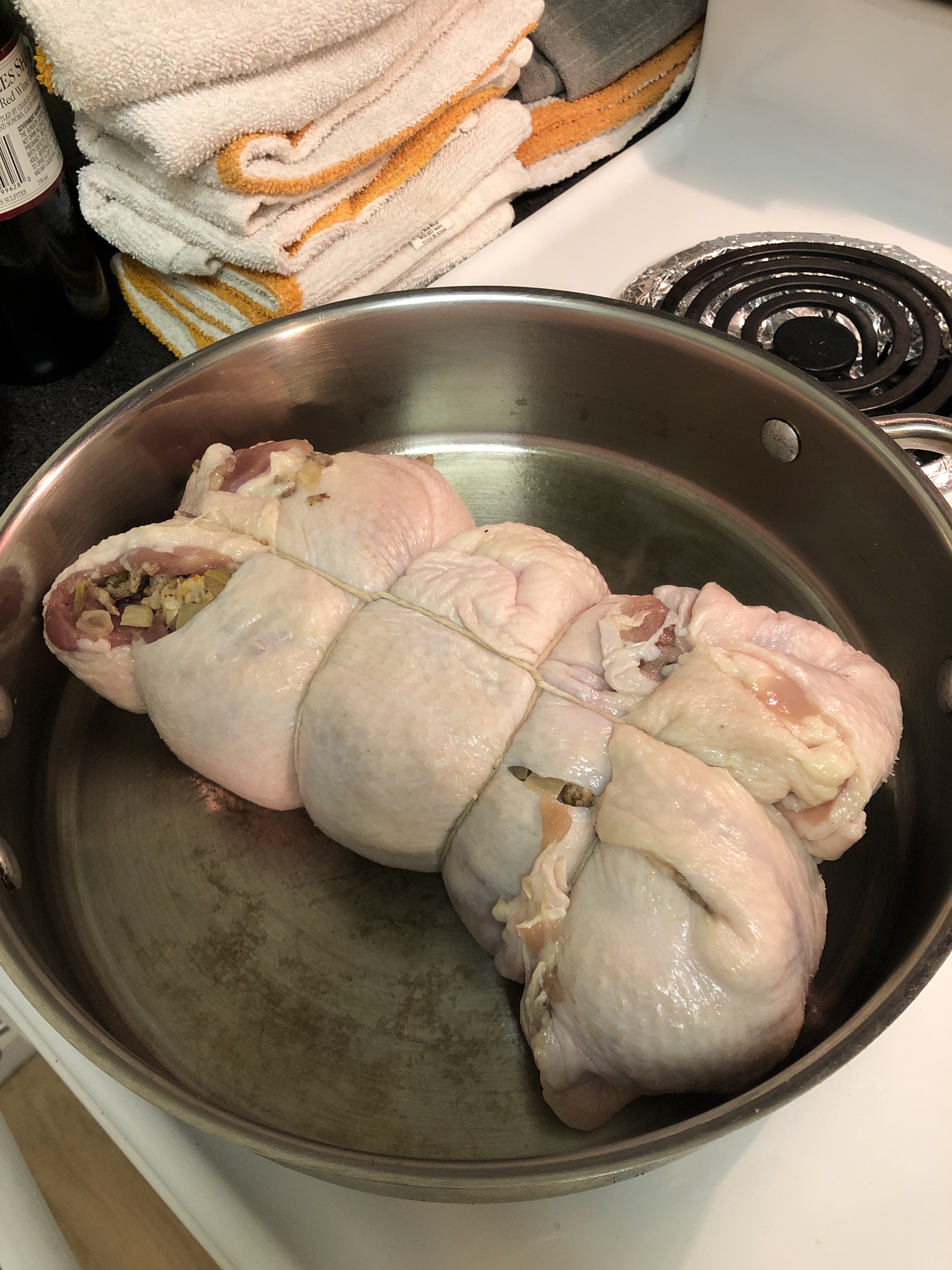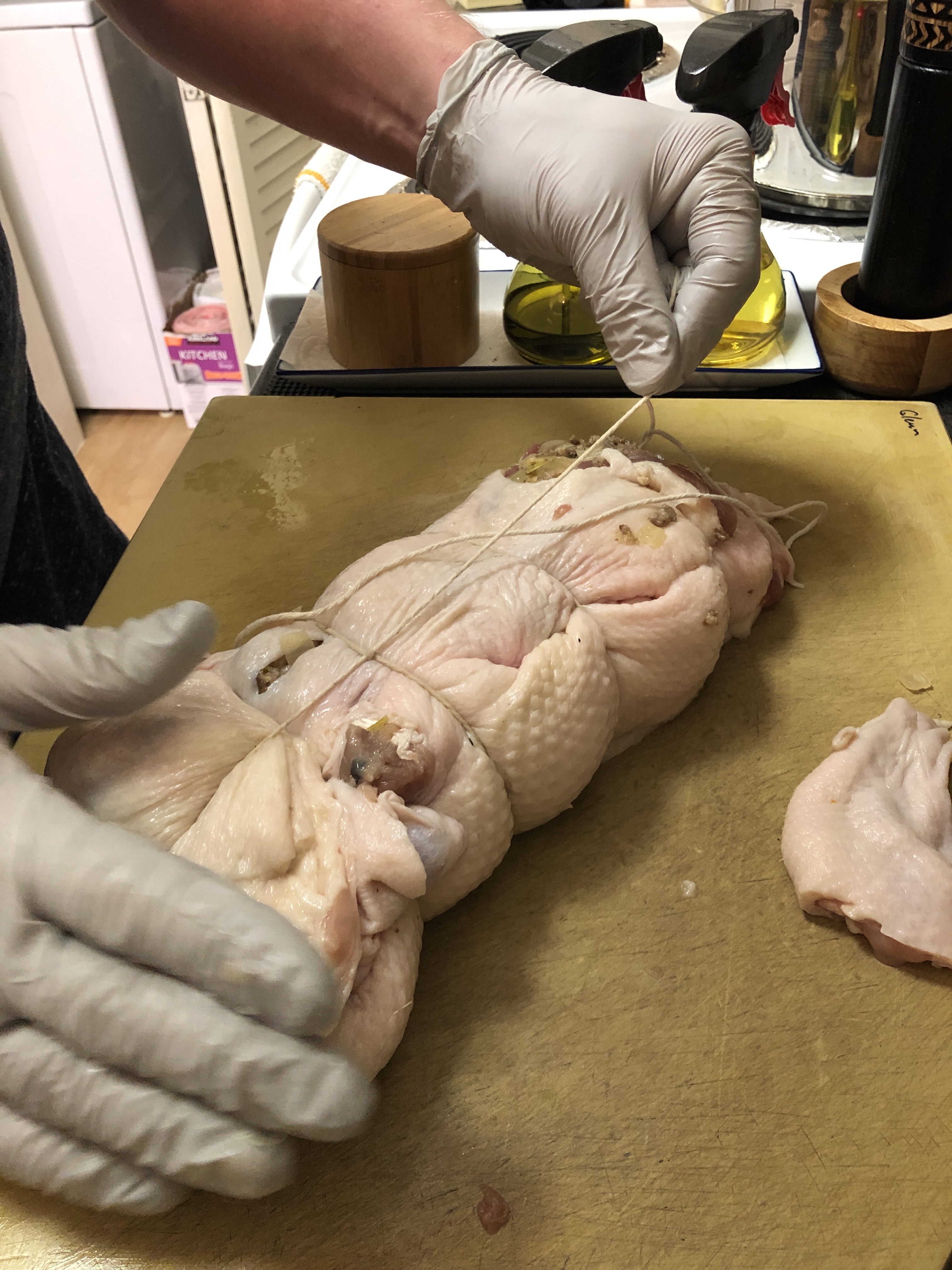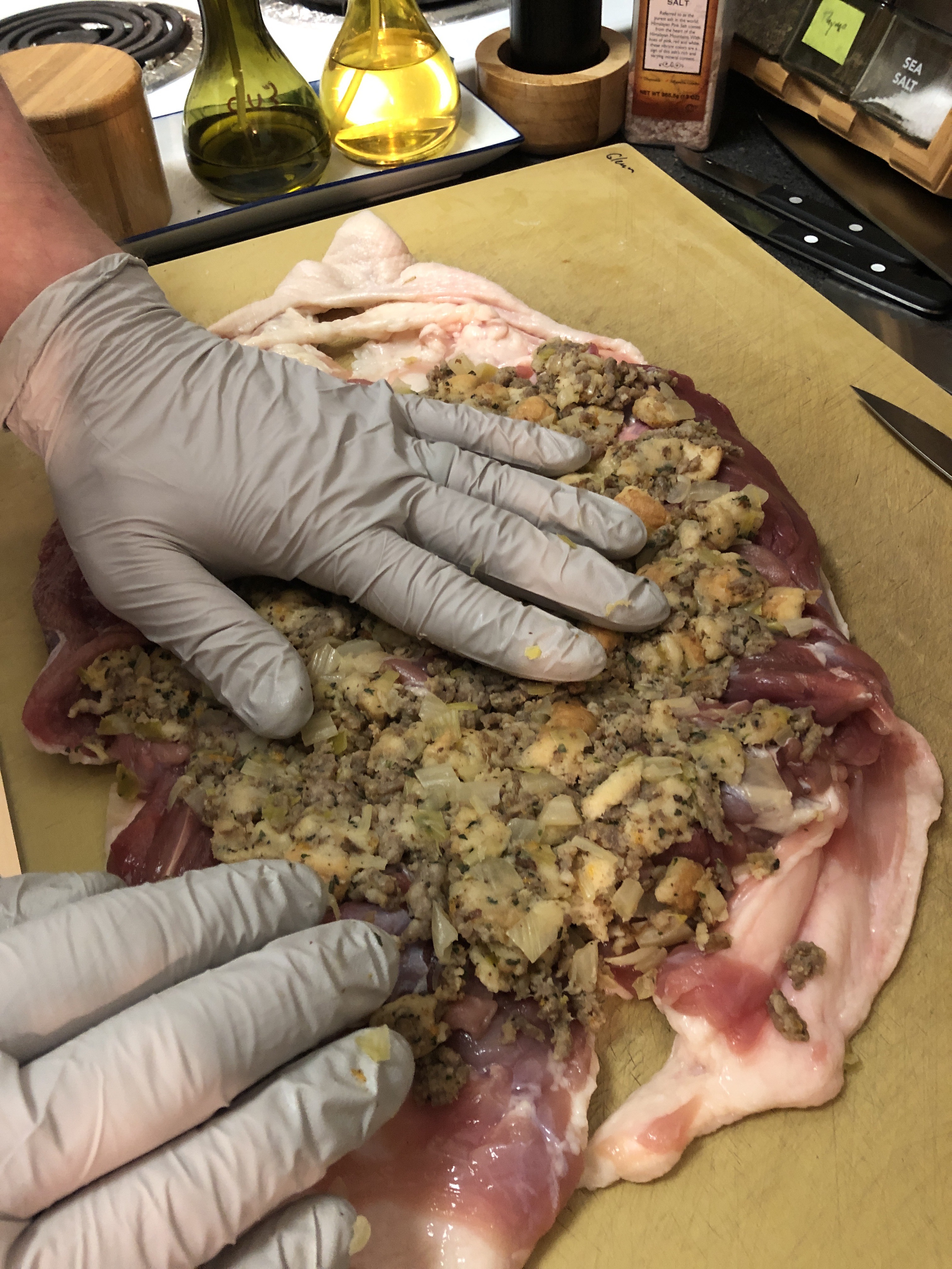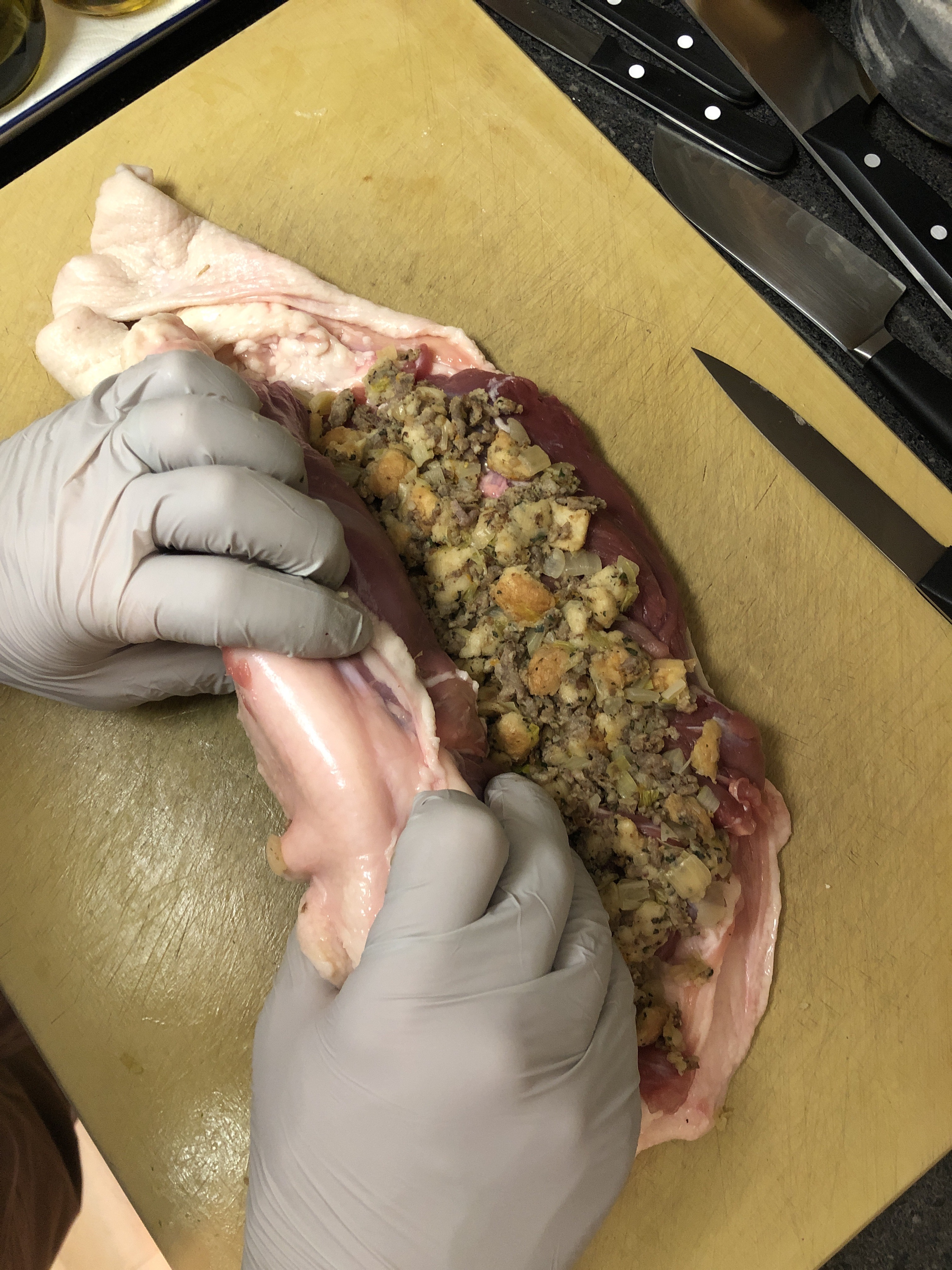 roll the meat around the stuffing, leaving as much of the skin out of the roll as possible, then wrap the skin around the roll, covering the meat entirely, and then truss with butcher’s twine.