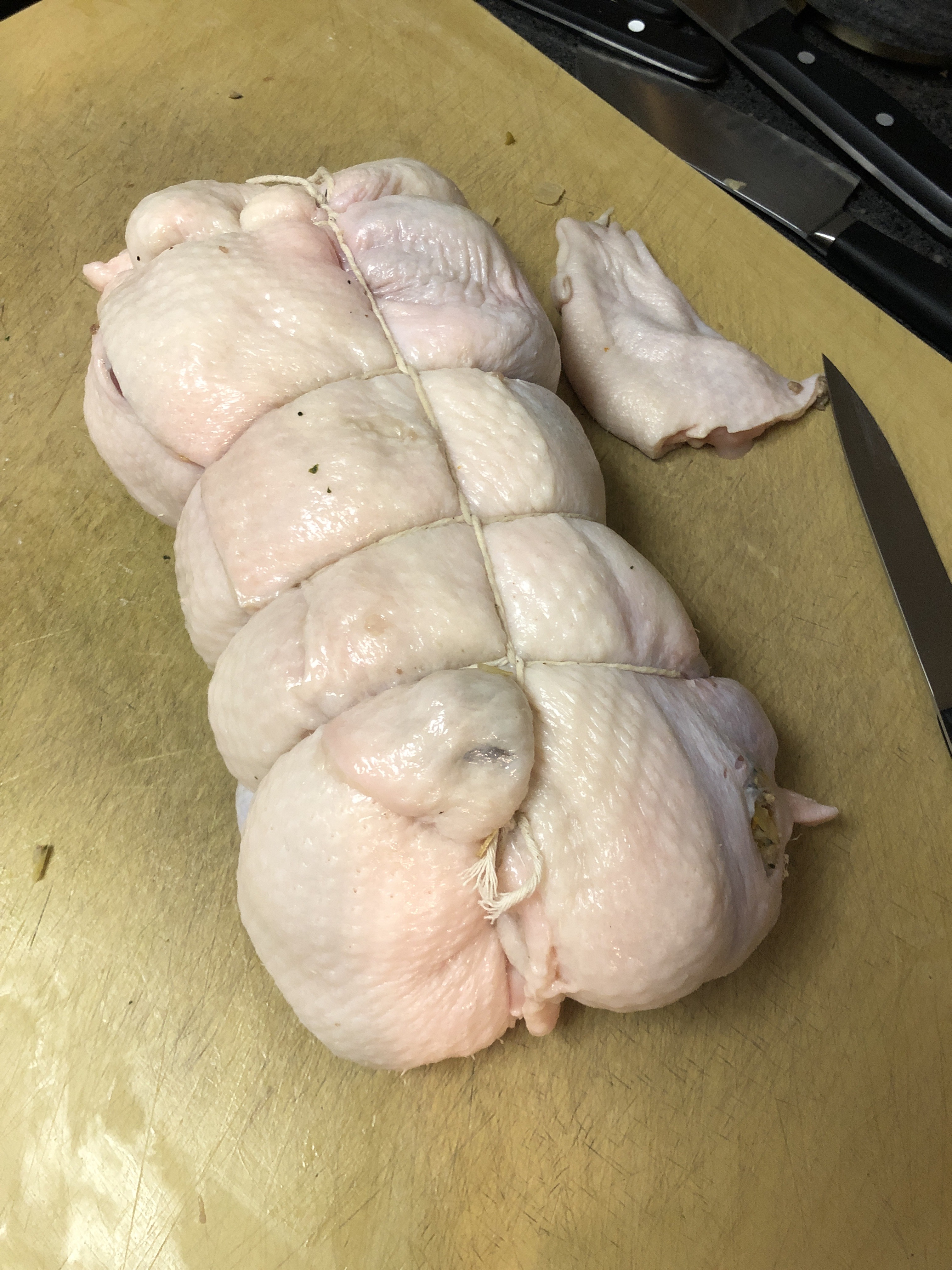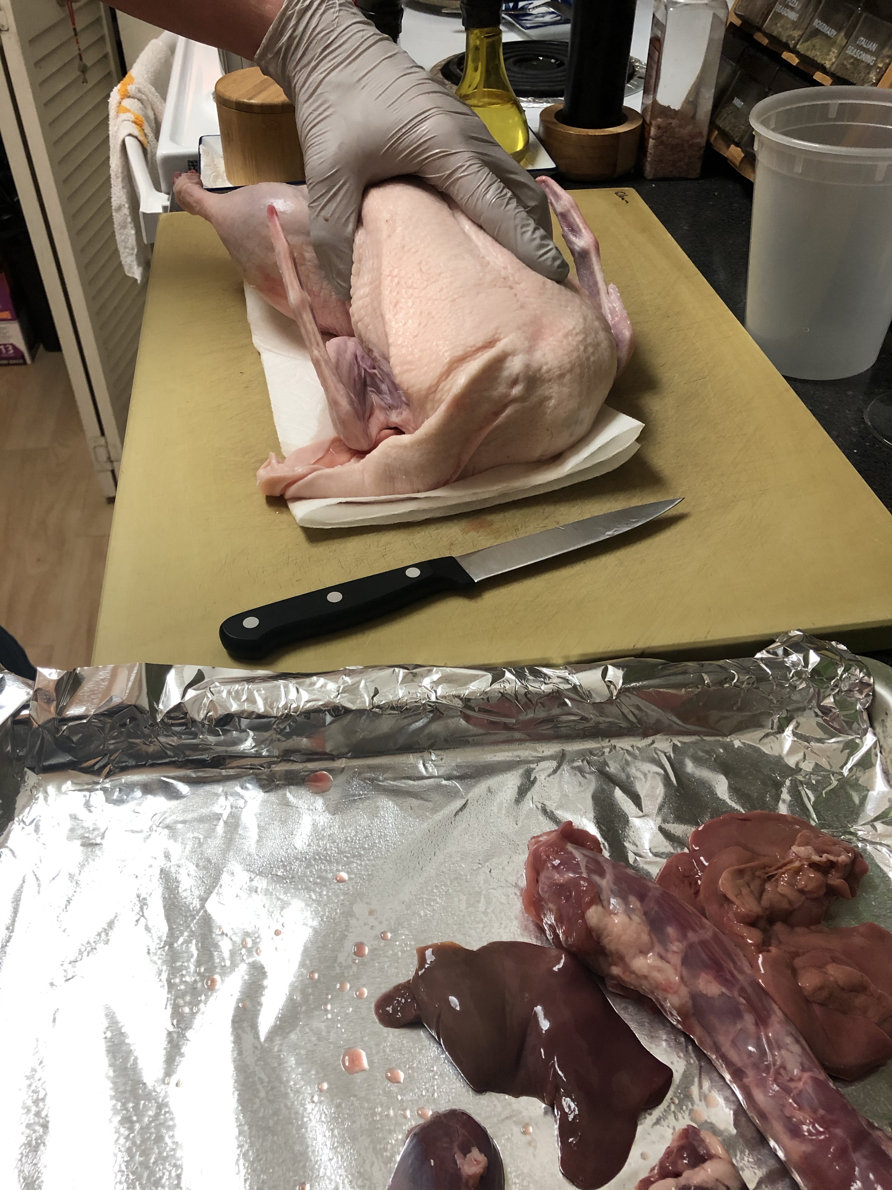 As opposed to just stuffing it and roasting it whole (which is a perfectly acceptable method of cooking a bird of any kind), I decided to have a little fun, and experiment. My plan was to completely de-bone the bird (typically when deboning, you still leave the leg bone in and the “drumstick” intact),