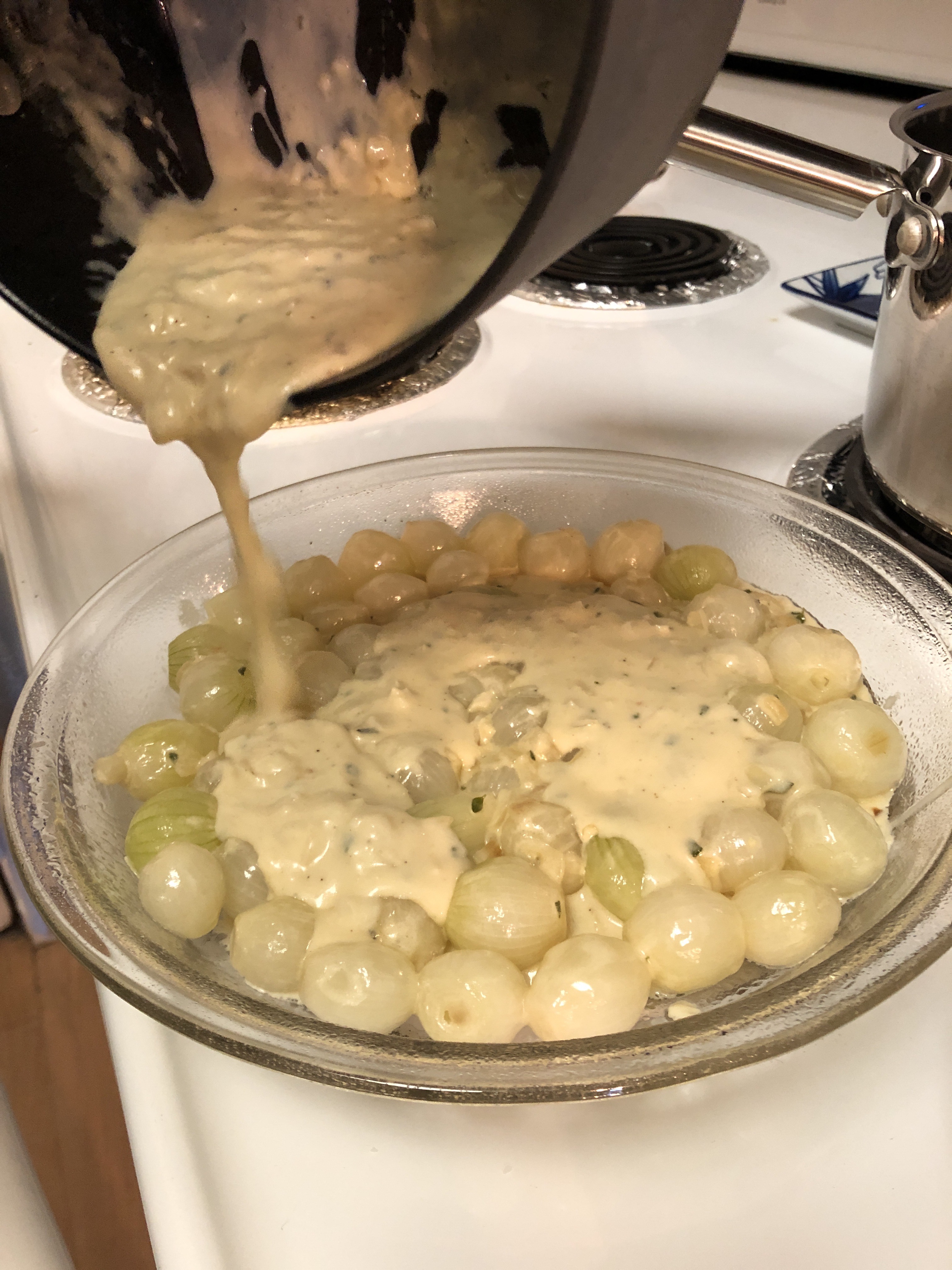 Regretfully, I can’t seem to find this recipe, but it’s a pretty straight-forward béchamel sauce, poured over blanched pearl onions, topped with crushed ritz crackers, and baked. Nod to 20th century American “cuisine” right there!