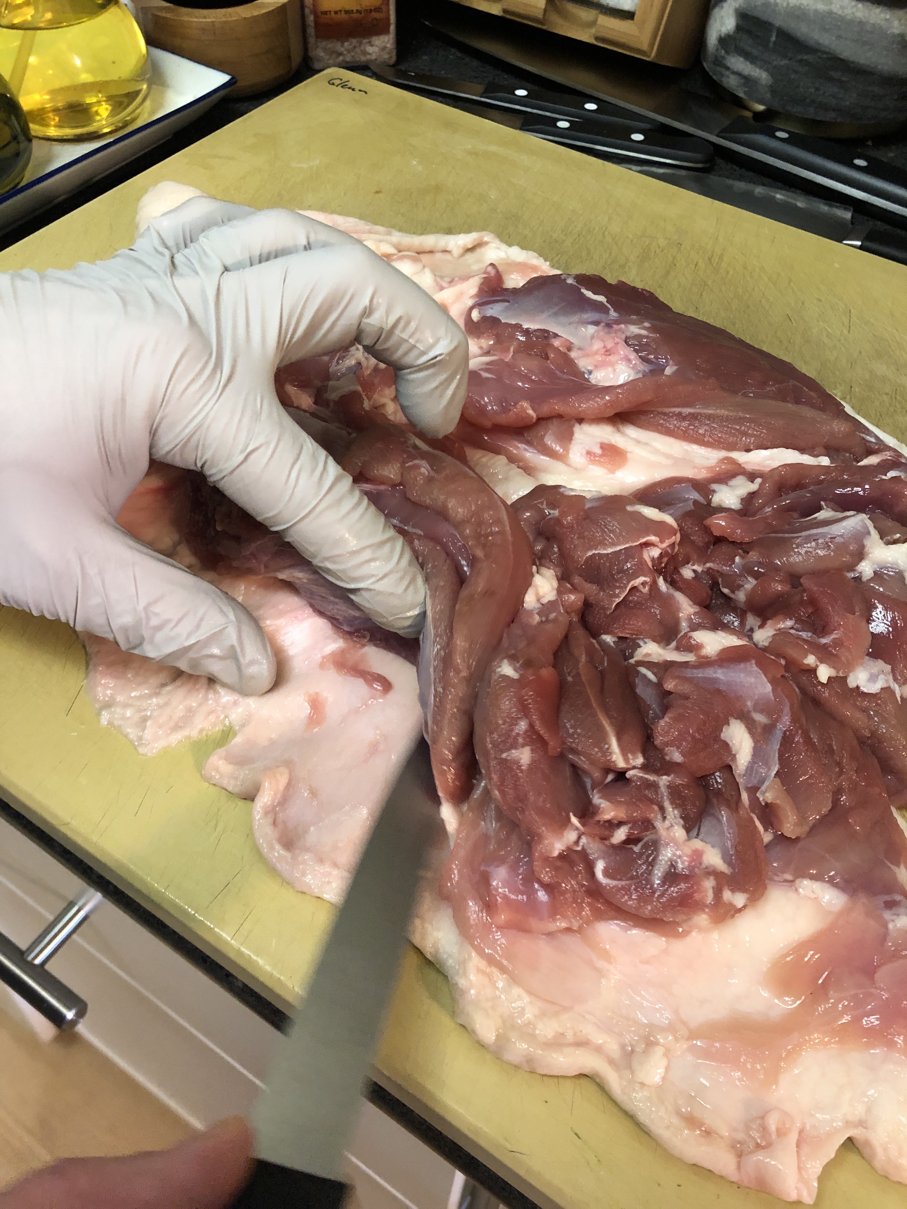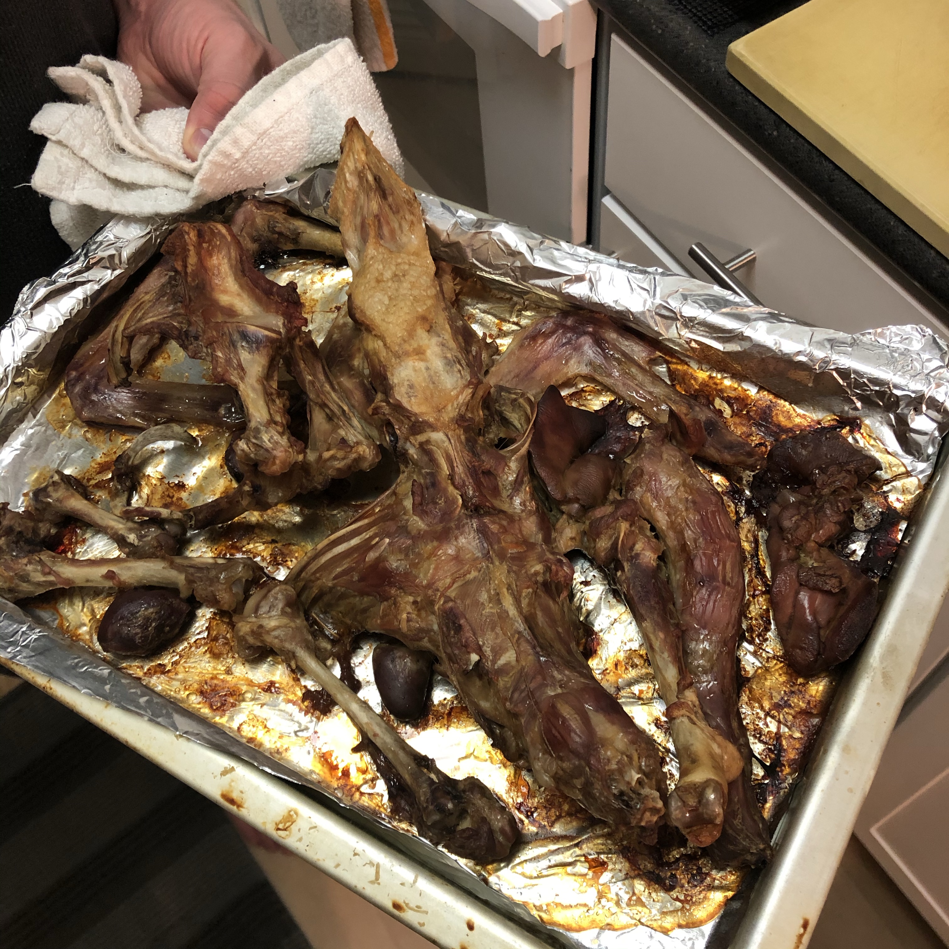 The goal here is to remove the meat and skin from the carcass and then roast the bones which then get used to make stock.