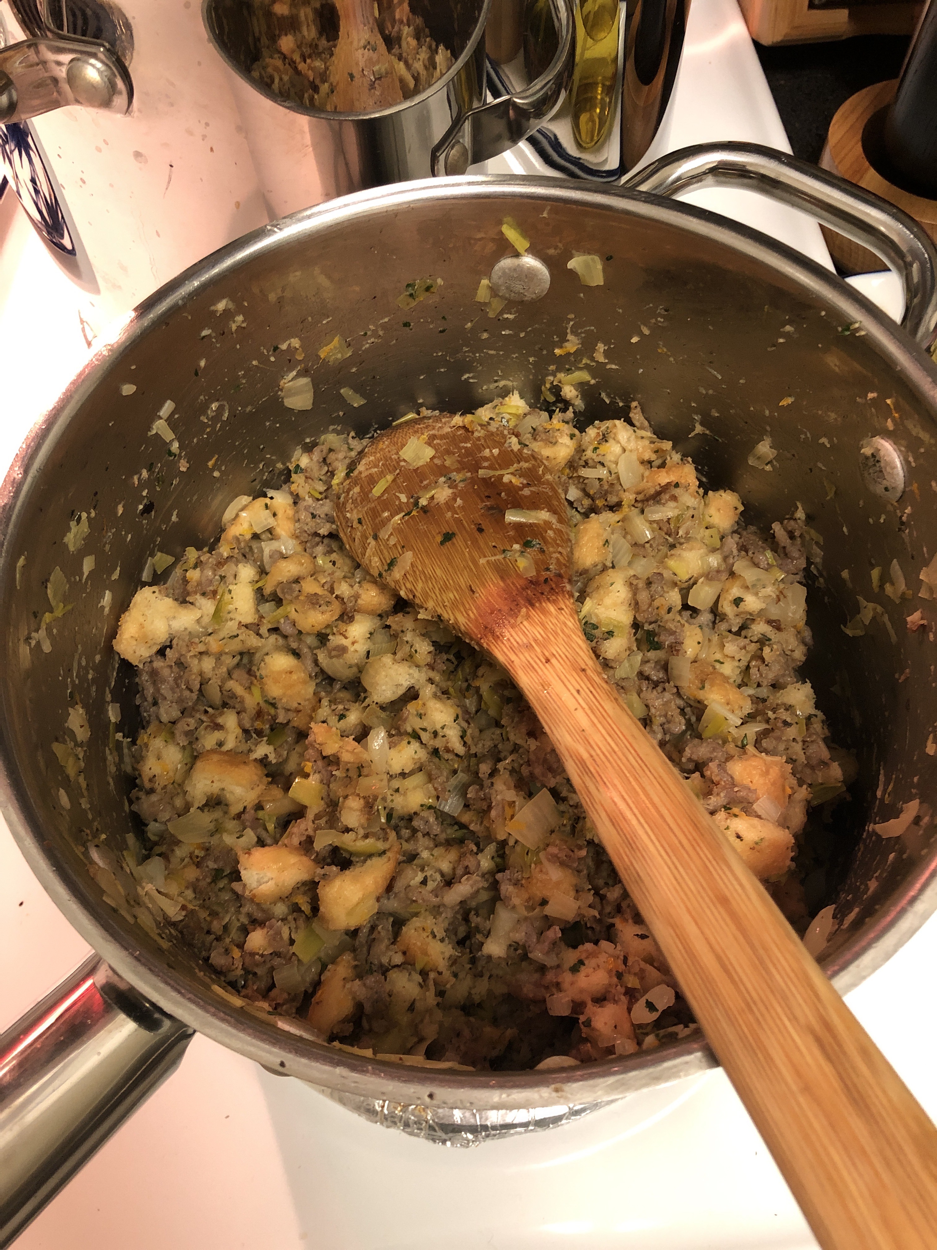 The main goal of stuffing in a bird is to absorb the liquids and provide flavor. You want it to be moist, but not mushy.
