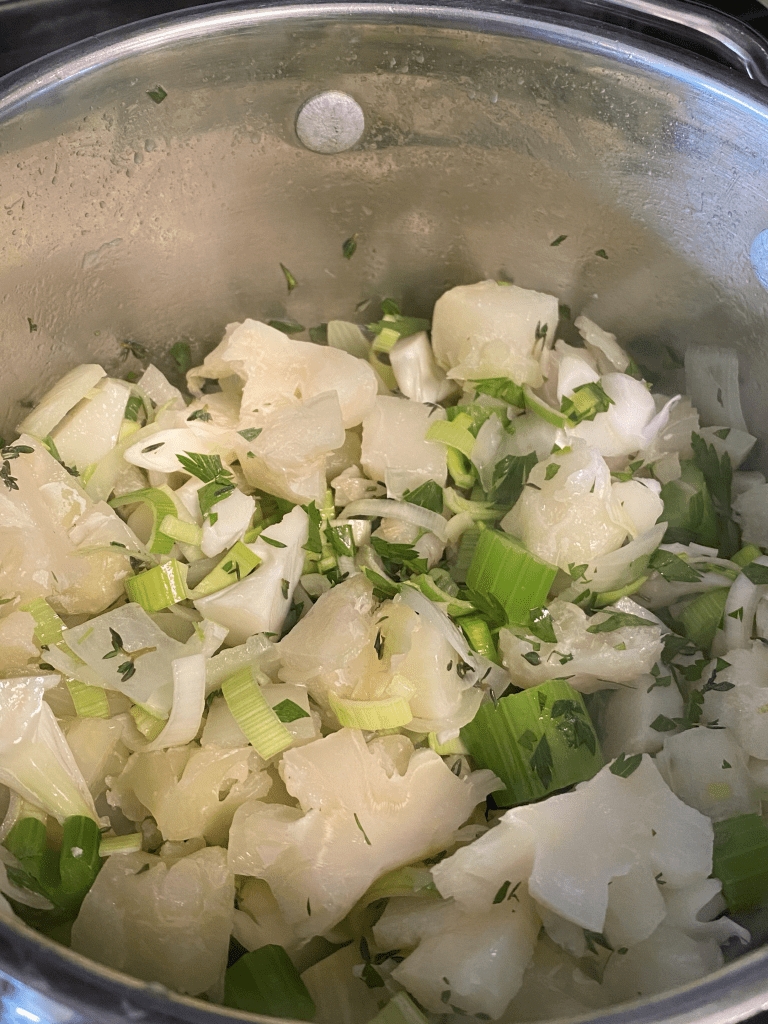 Add the leeks, cauliflower stems, bay leaves (make sure to count how many you’re putting in, because you’ll be taking them out later), garlic, and chopped herbs, and continue to sweat until all liquid has been released and cooked off (probably another ten minutes).