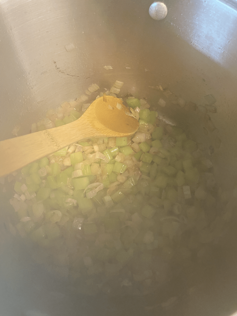 Put a heavy-bottomed pot on medium heat, and add a tablespoon of cooking fat/oil of your choice (I went with rendered bacon fat!). Once the oil is hot, add the onions and celery, and allow them to slightly caramelize.
