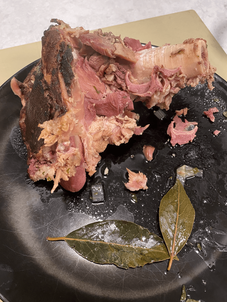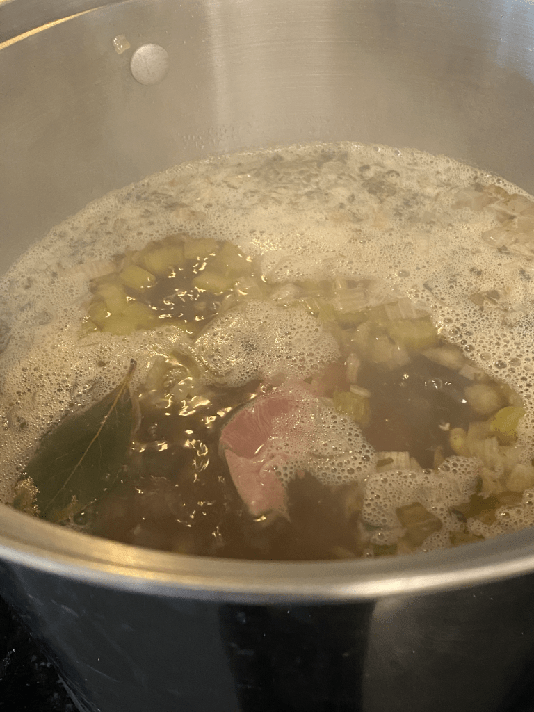 Once they have some color, add the shallots, parsley and garlic, and sweat for about a minute. Then add your ham bone and bay leaves, and add enough water to cover the bone (should be about a gallon).
