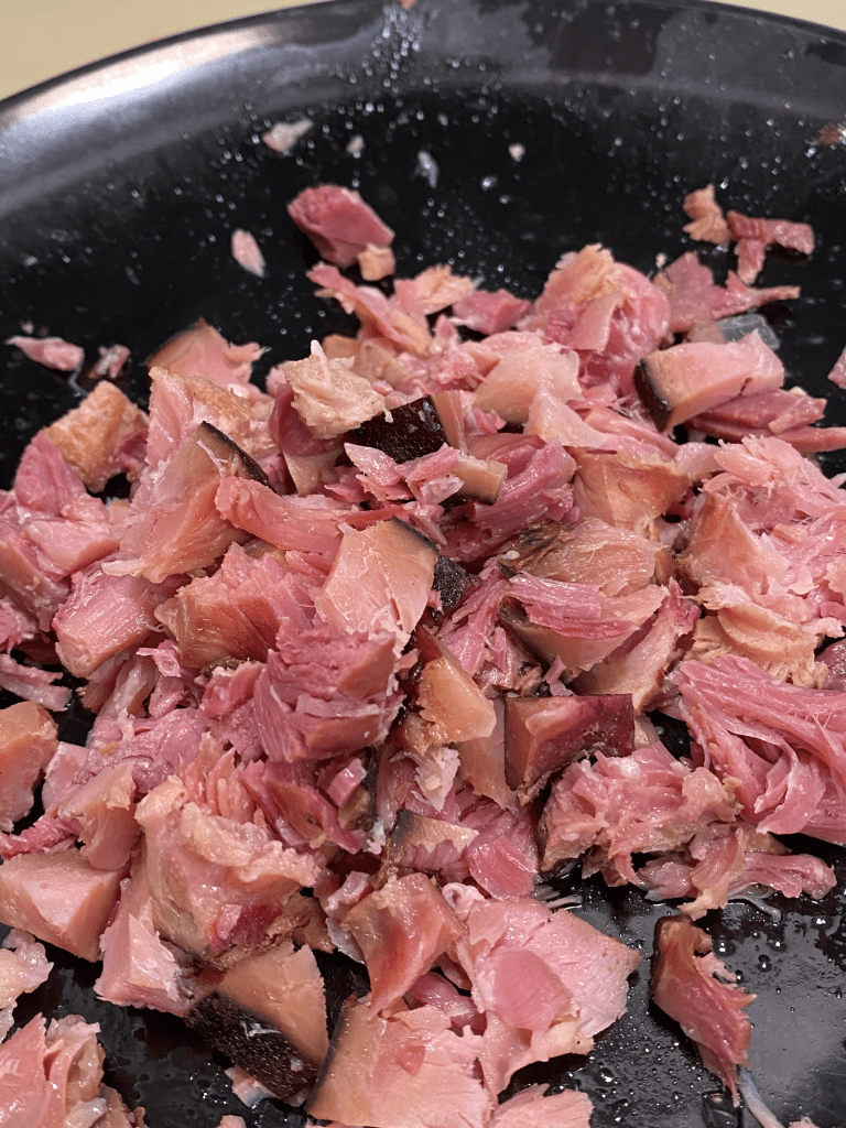 Cut all excess meat off of the ham bone that you can. You don’t need to be perfect with it, as you’ll be getting the rest later.
