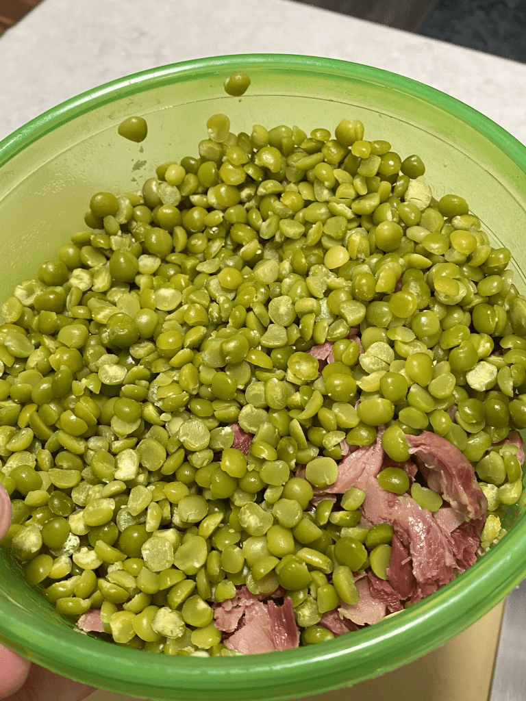 At this point, take roughly half of your cooked peas, and set them aside with the ham.