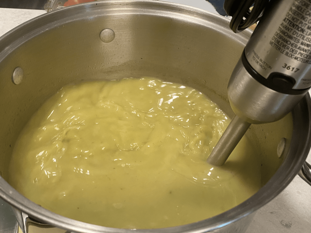 Add the remaining peas to the soup pot, and puree everything with a stick blender.