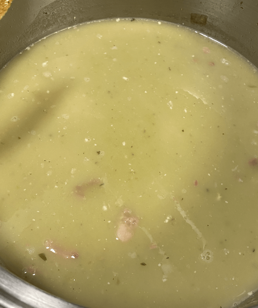 Add ham, and remaining split peas (don’t blend them!). Season to taste with salt, black pepper, and a bit of fresh-grated nutmeg. Stir, and you’re done!